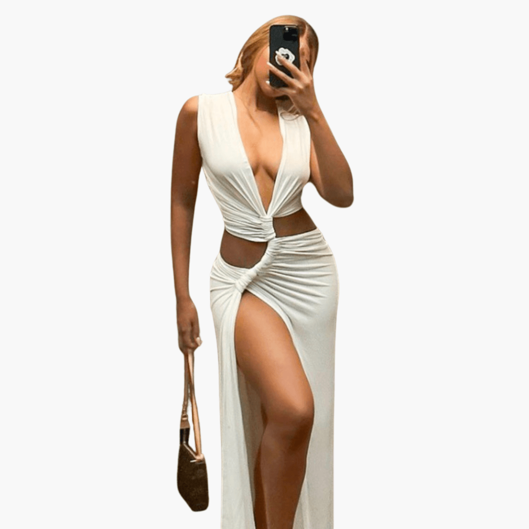 With this stunning summer dress featuring a cut-out, V-neck, and a sensual side slit, you make a statement wherever you go. It combines feminine elegance with a modern touch – perfect for gala evenings, celebrations, or stylish dinner dates. The flattering fit accentuates your silhouette while the design gives you a confident aura.