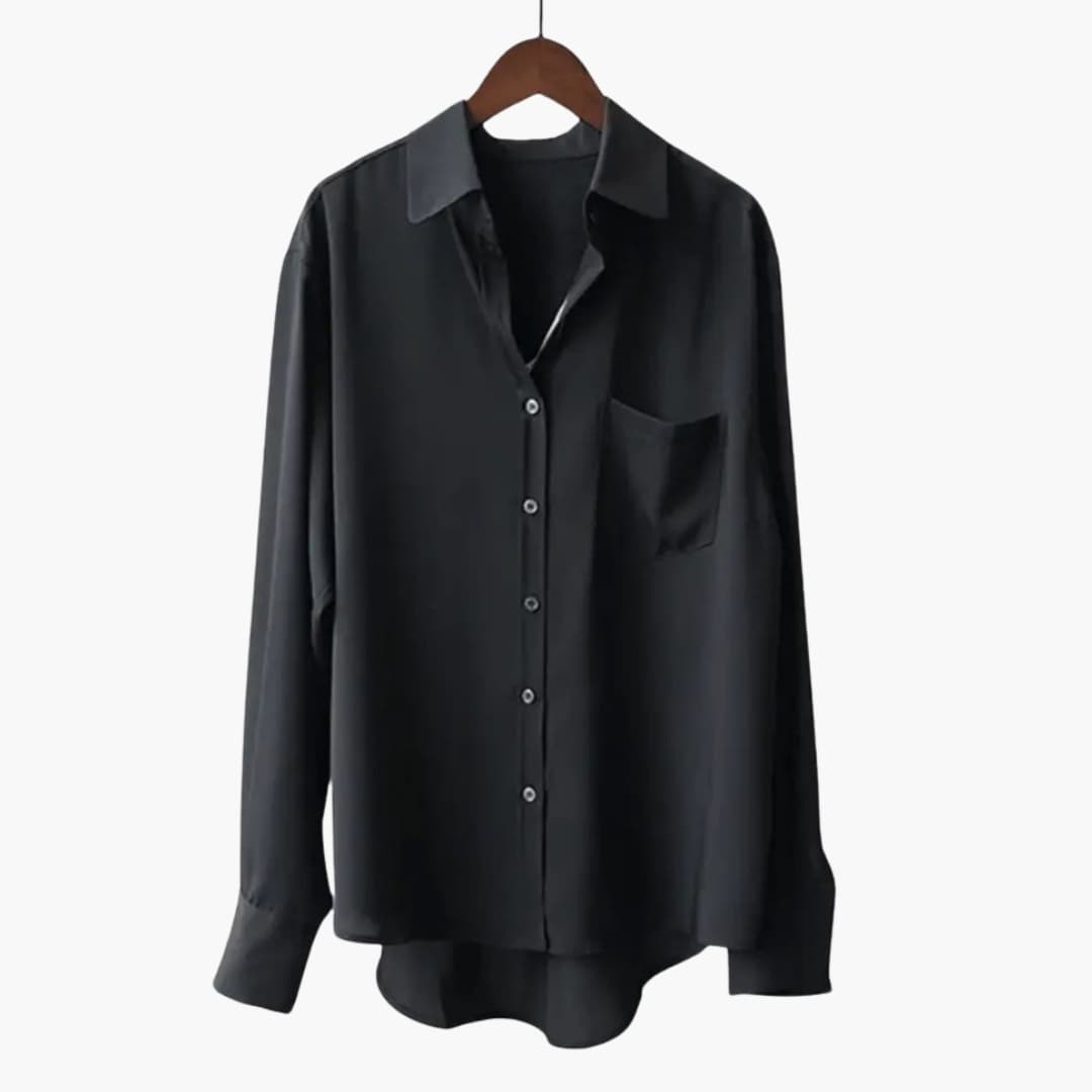 This women’s shirt features a pointed collar and front button fastening for a structured, balanced design. A single chest pocket adds practical detailing, while the long sleeves can be rolled for adaptability. The curved hemline and plain woven surface form a clean silhouette appropriate for both formal and relaxed settings.