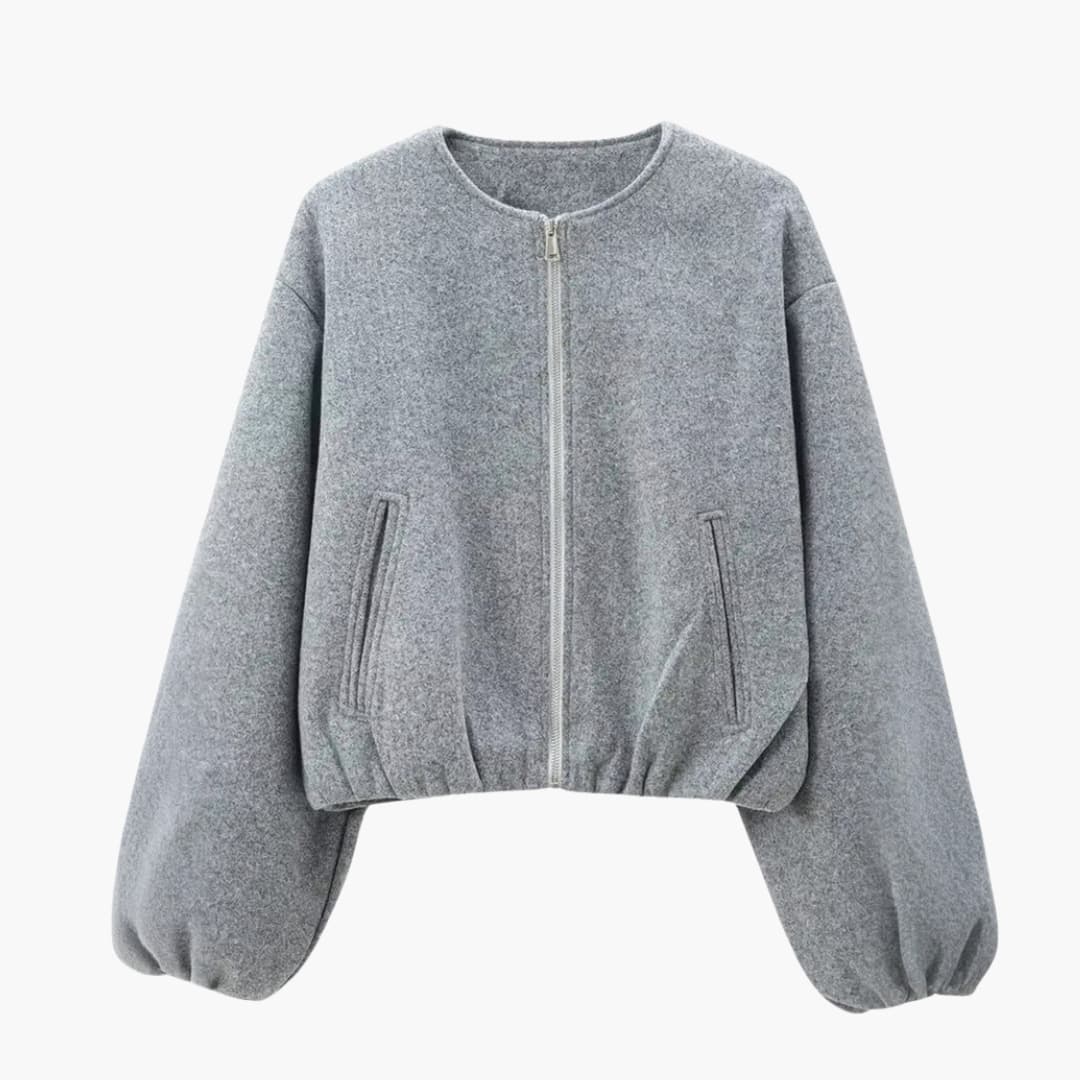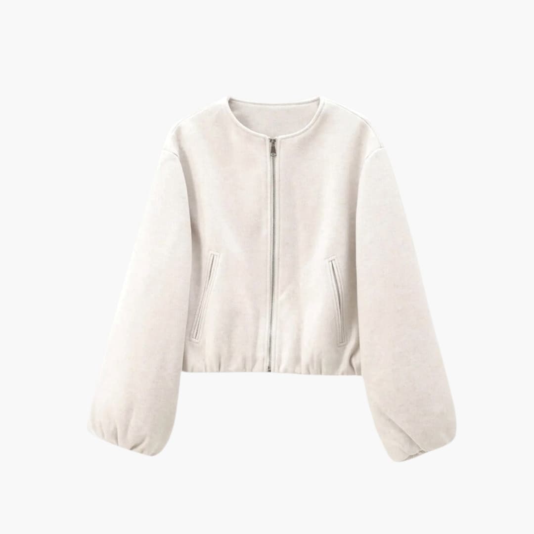 This women’s cropped jacket is designed with a round neckline, full front zipper, and long balloon sleeves. It includes two angled side pockets and a woven finish. The hem is elasticated, giving a defined cropped silhouette without added bulk. Suitable as a short layering piece, the jacket maintains a balanced and structured profile for various outfits.