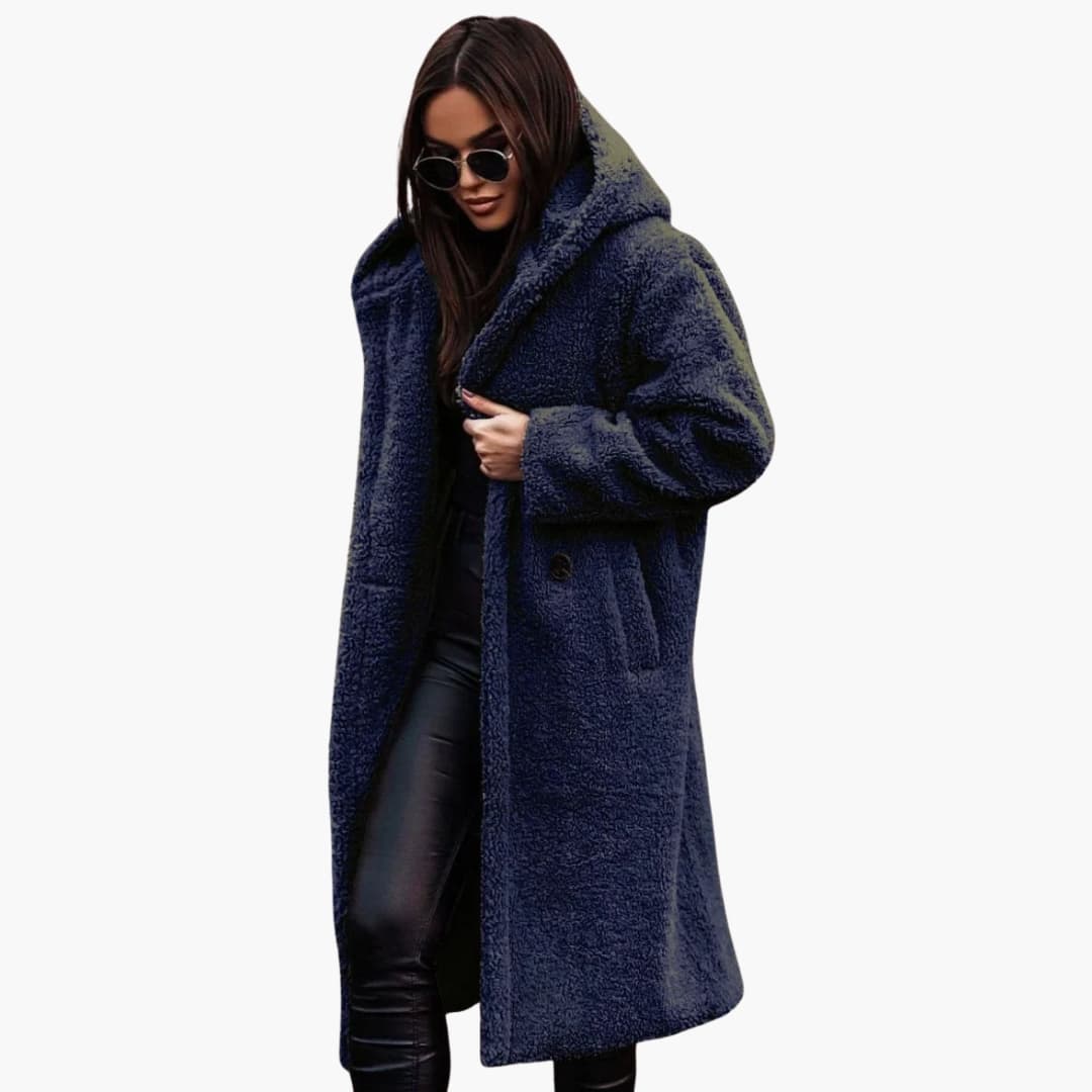 This women’s coat features a fixed hood and an extended collar at the neckline. The front closes with full-length buttons. Two side pockets are integrated for storage. Long, straight-cut sleeves provide full coverage. The hem is long, ending below the knee, and the surface is finished with textured fleece.