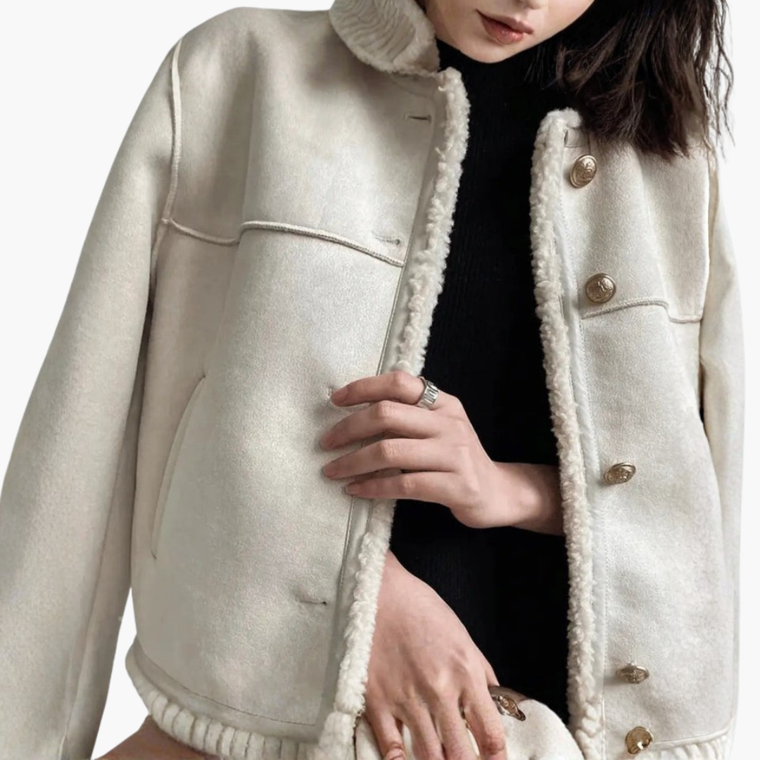 Women’s short jacket featuring sherpa-style edging and fleece-lined interior