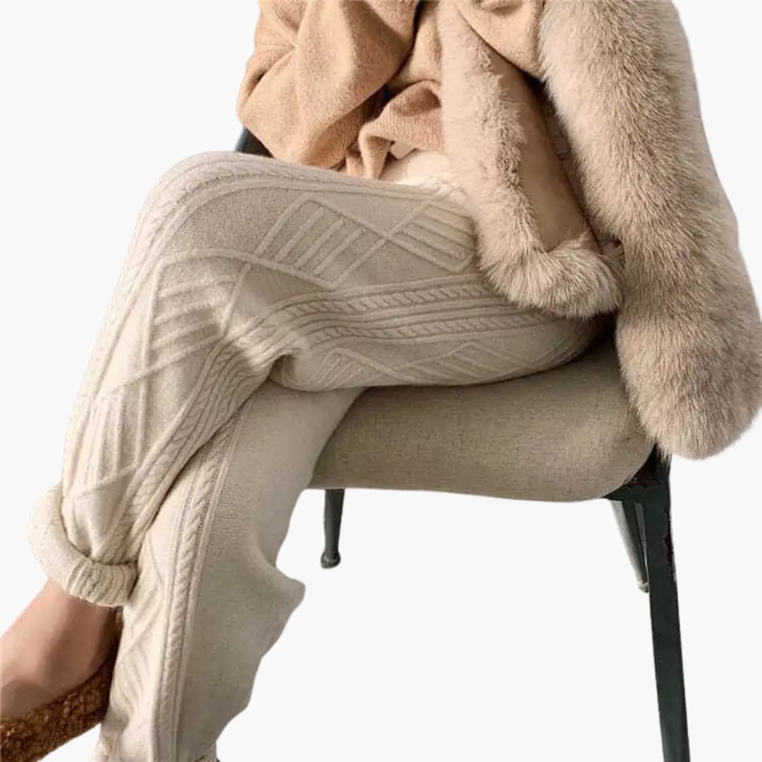 These women’s knit jogging pants feature a straight shape with a modern appearance. The elastic waistband with pull-on function allows for easy dressing without additional closures. The legs comfortably reach the ankle and emphasize the relaxed silhouette. The ribbed cable-knit pattern highlights the textured surface and adds a classic knit character to the pants. The versatile shape is suitable for various combinations in everyday life and leisure.
