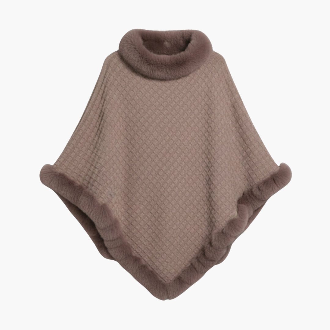 Women’s oversized knit poncho featuring faux fur trim and chunky cable knit for warmth