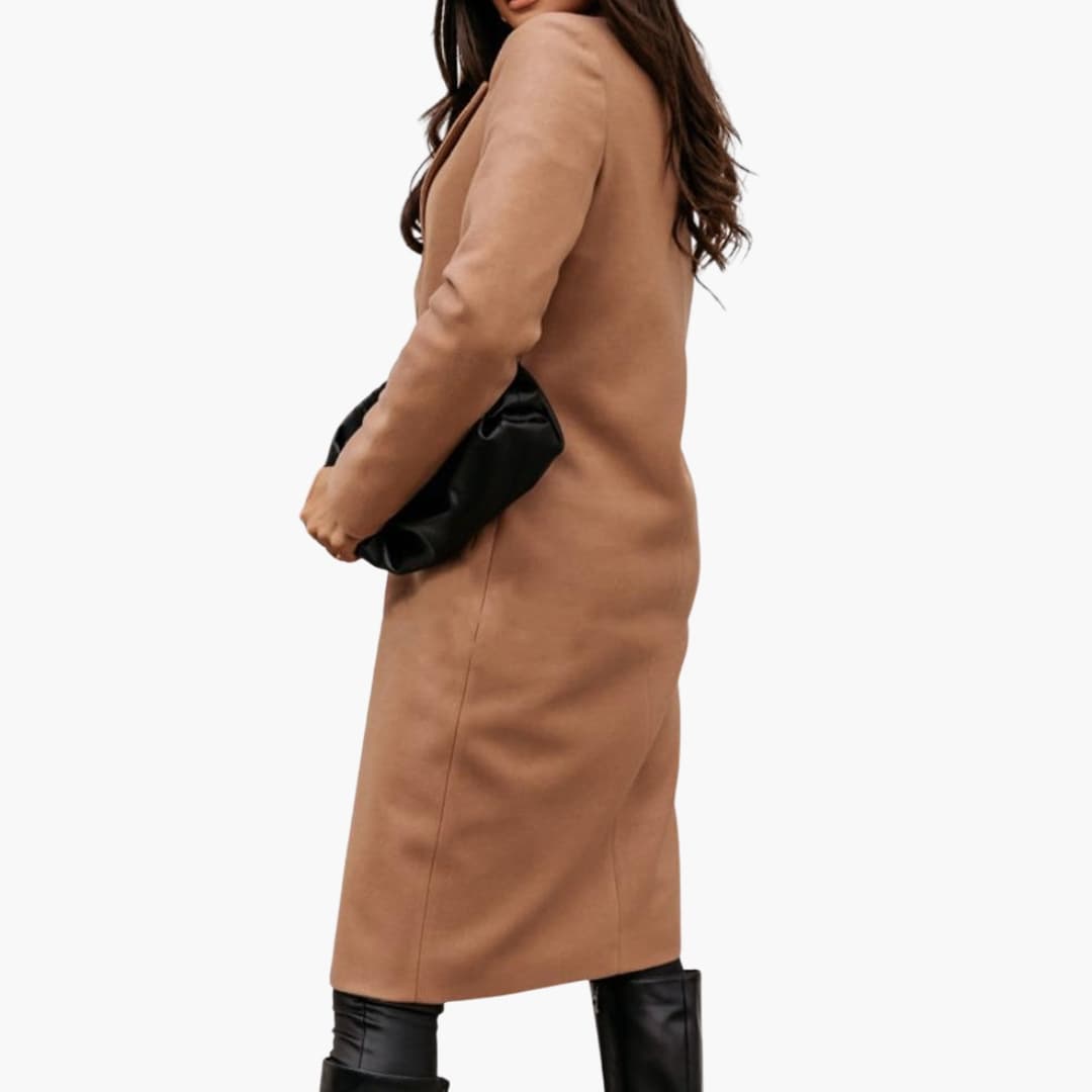Women’s long coat with button closure and structured notched collar.