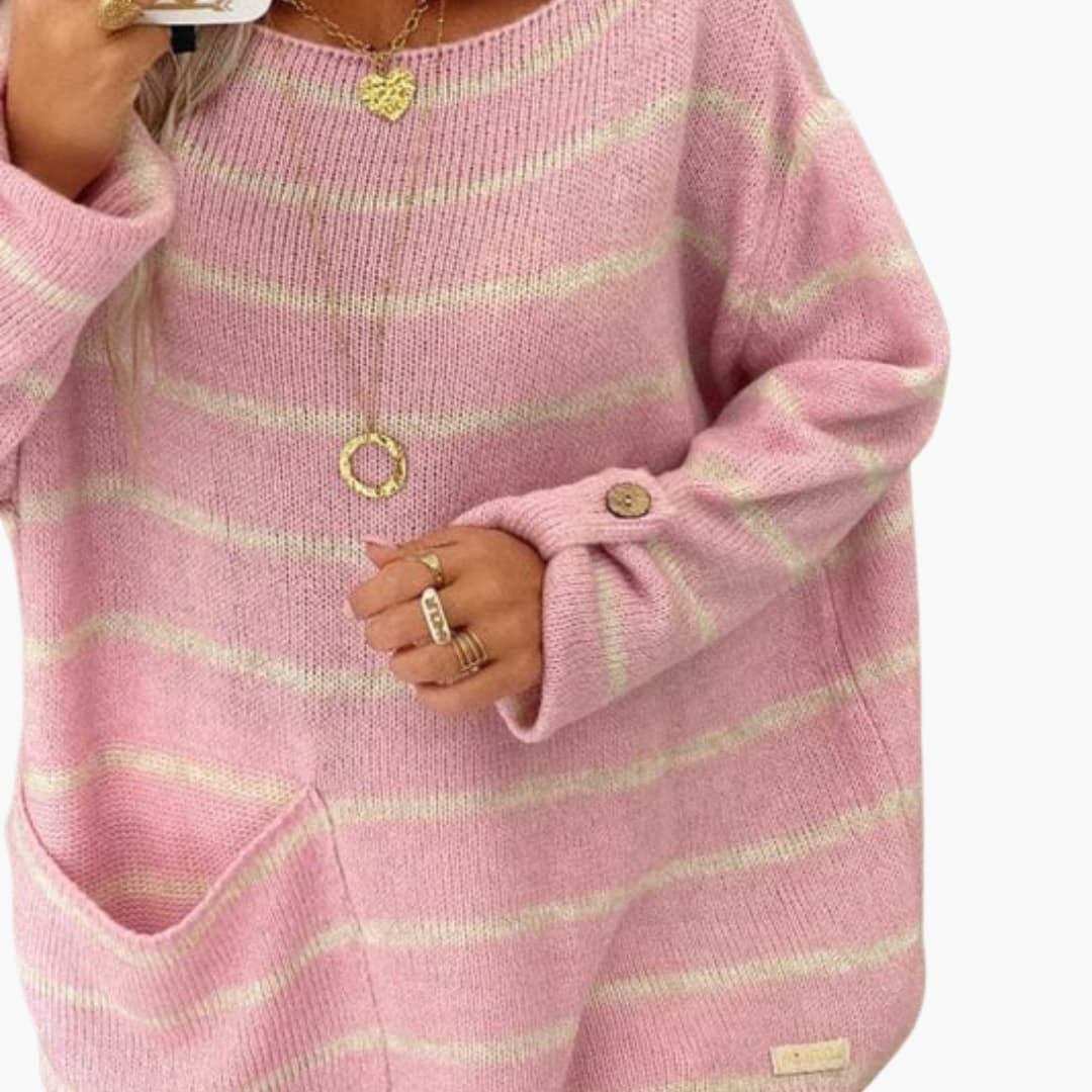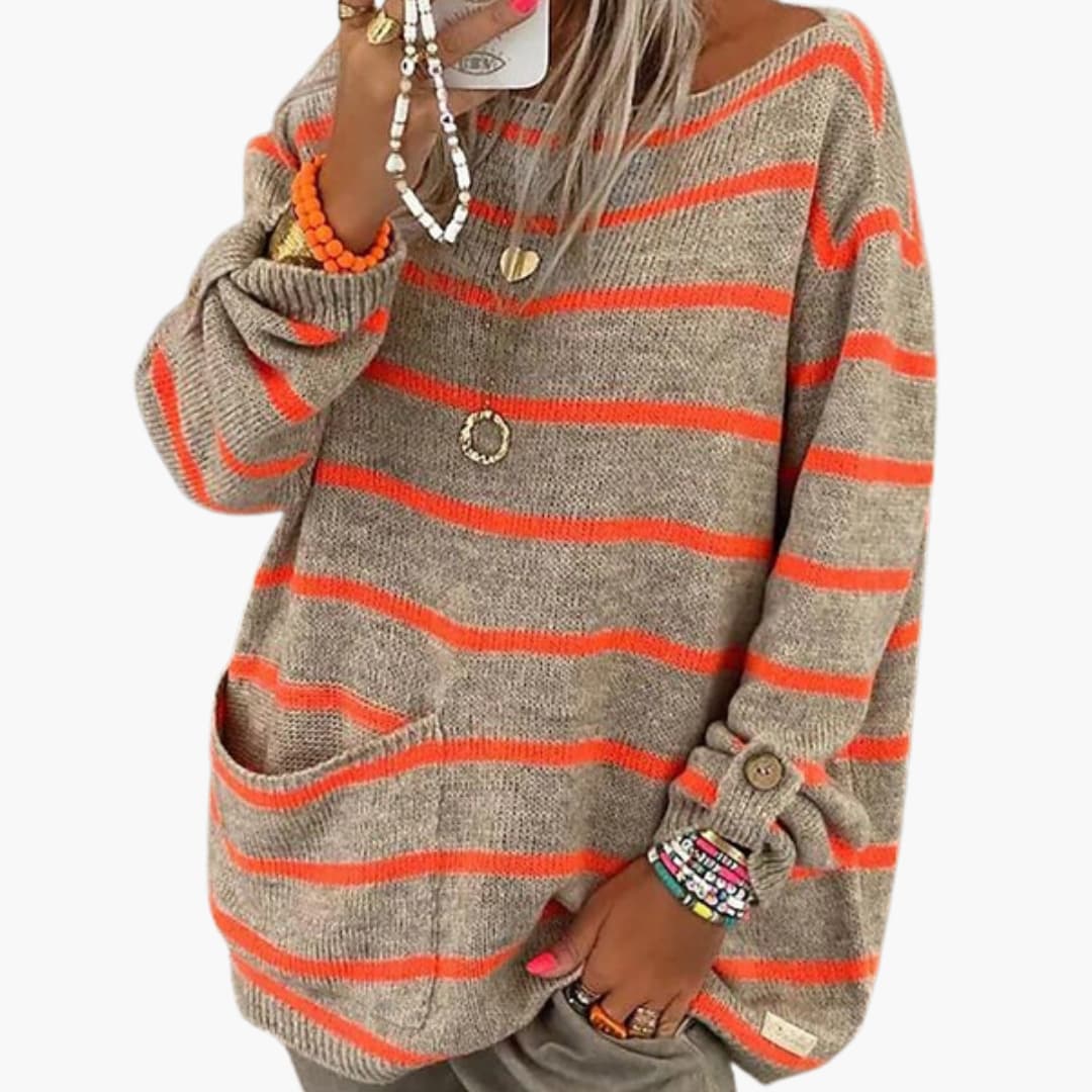 Striped women’s knitted sweater with boat neck and front pocket.