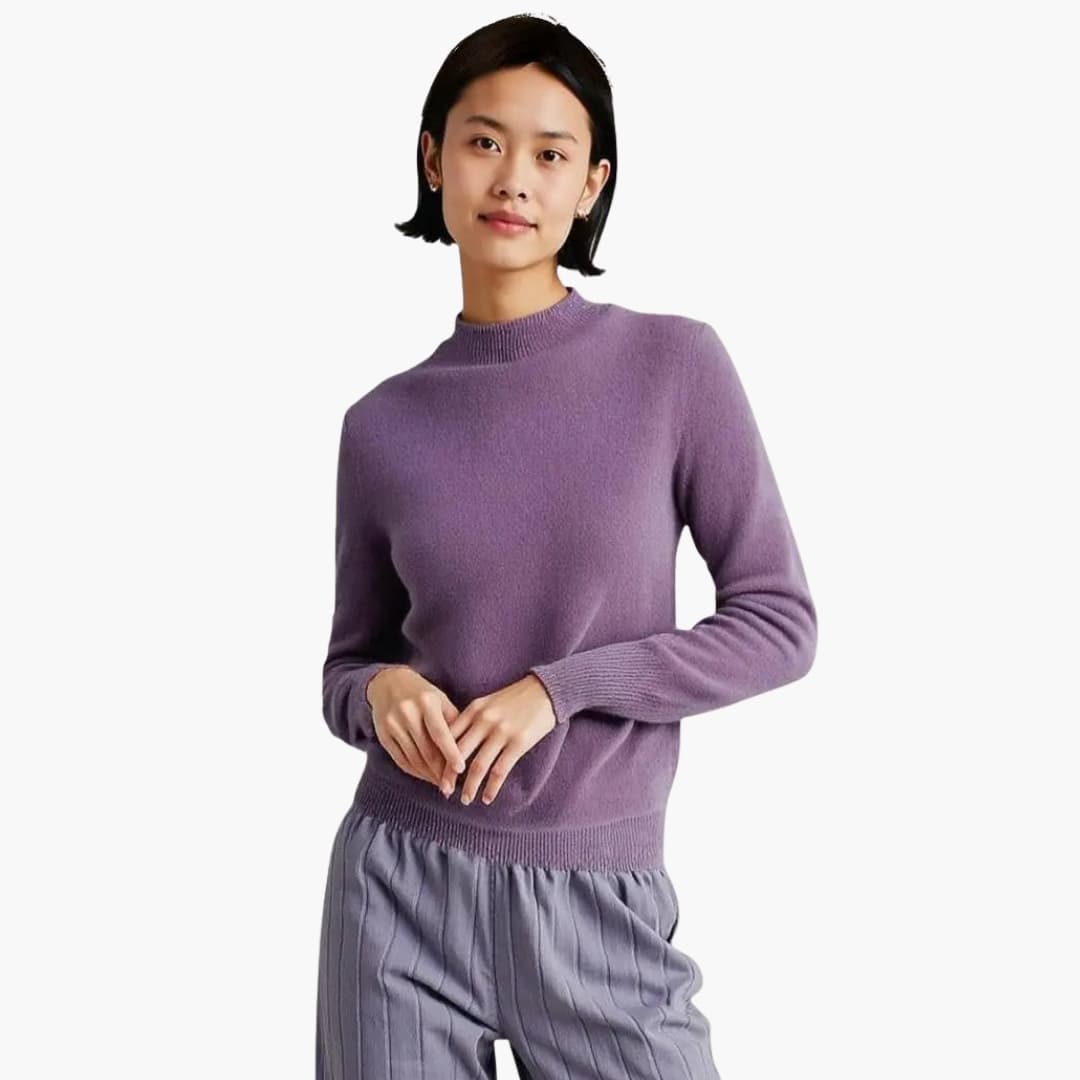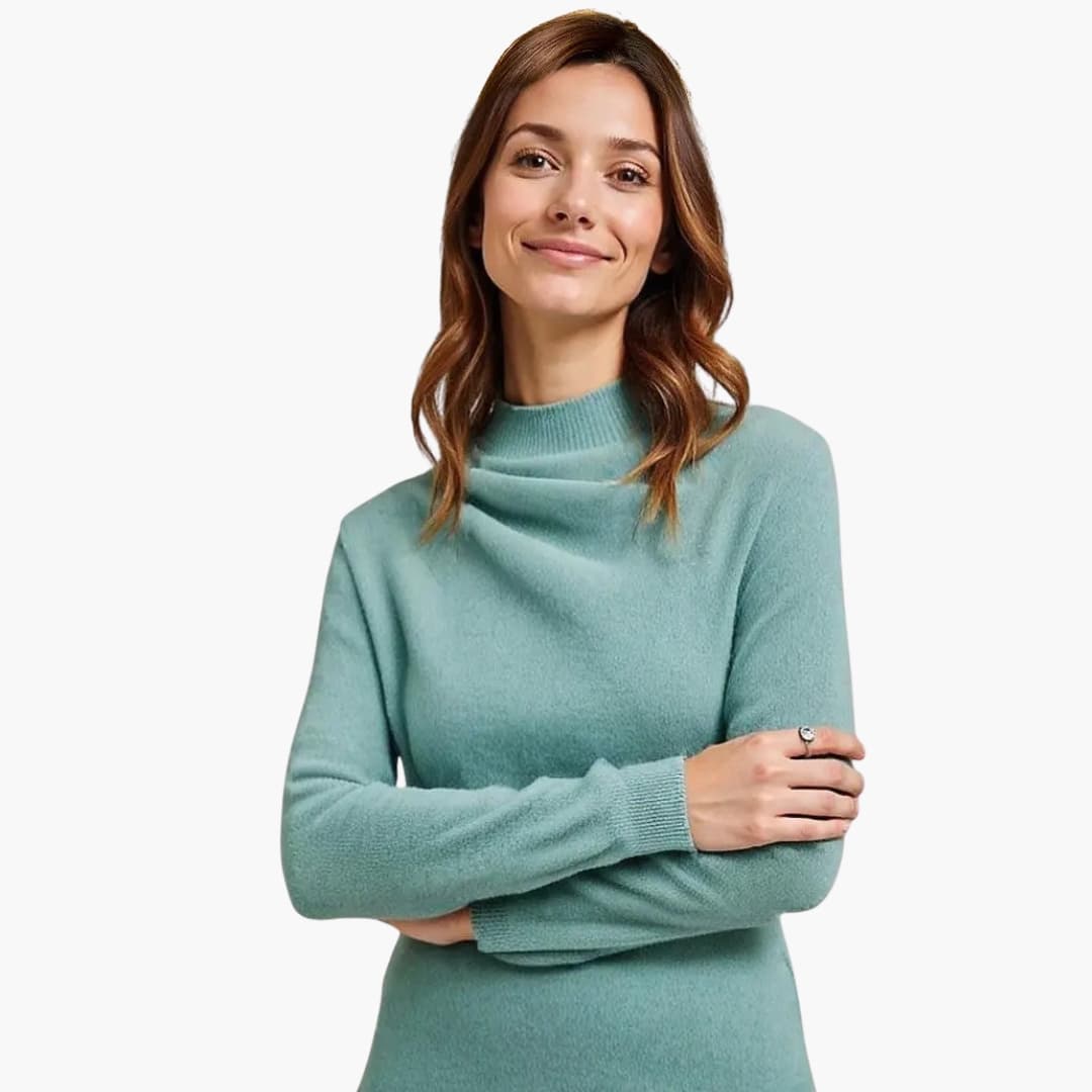 This women’s sweater features a draped neckline that forms soft folds around the collar area. The long sleeves end with ribbed cuffs, while the straight ribbed hem completes the shape. The knitted surface shows a uniform texture, creating a balanced silhouette suitable for layering or coordinated looks.