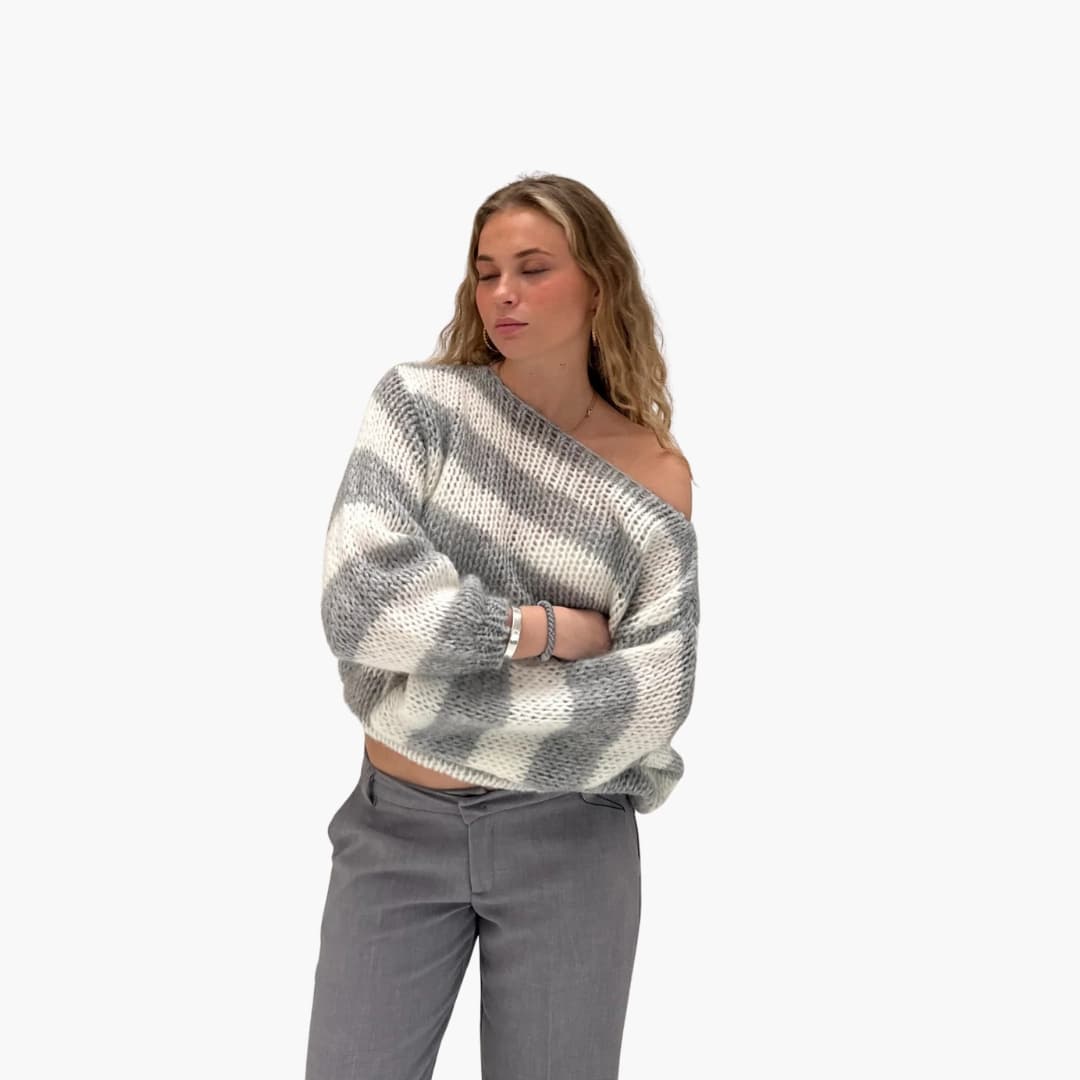 This women’s sweater features a round neckline without a closure. The body is cut straight and finished with a ribbed hem. The long sleeves end in simple cuffs, and the entire surface showcases a continuous stripe texture. The sweater can be worn alone or layered over other tops.