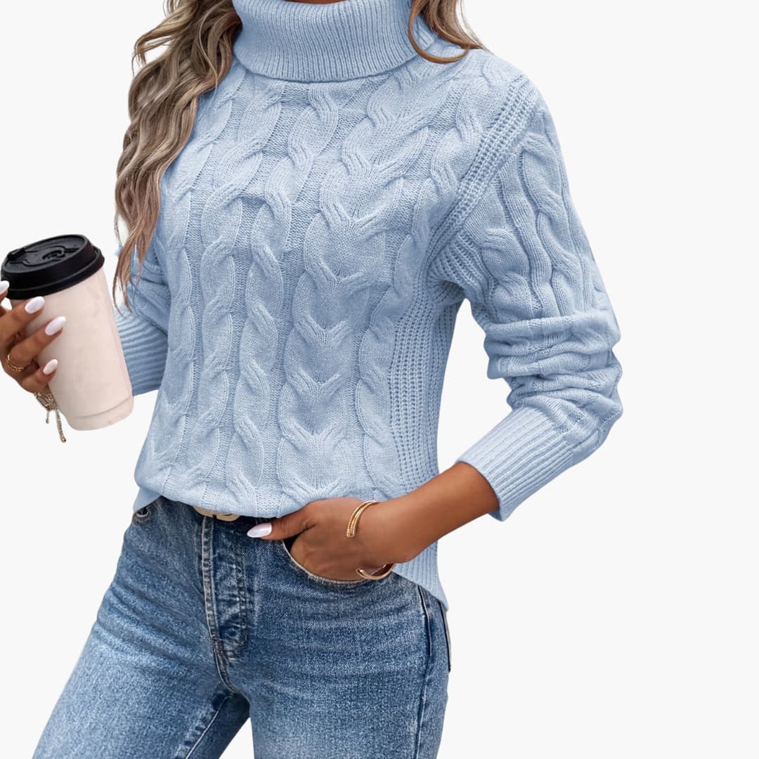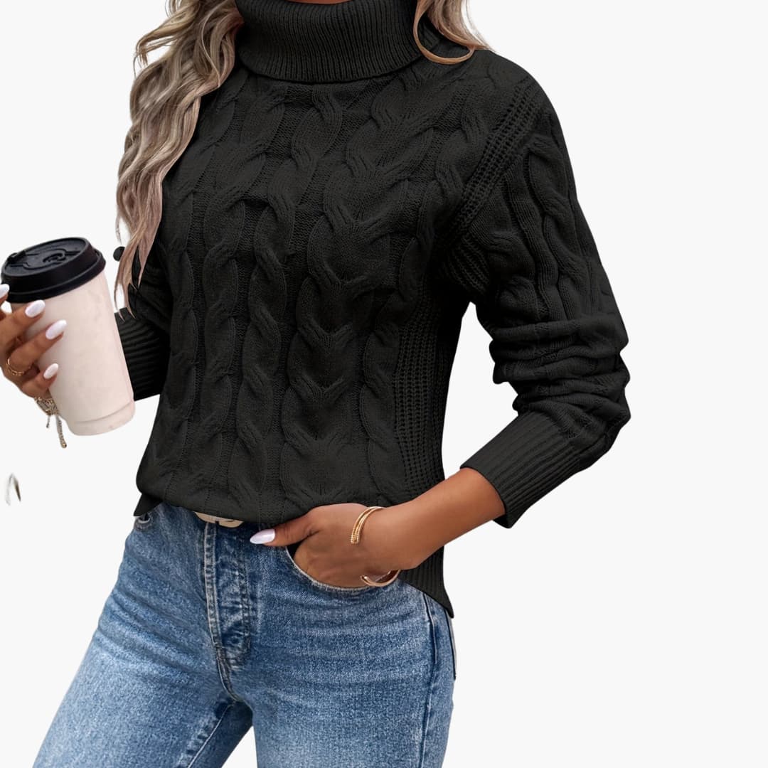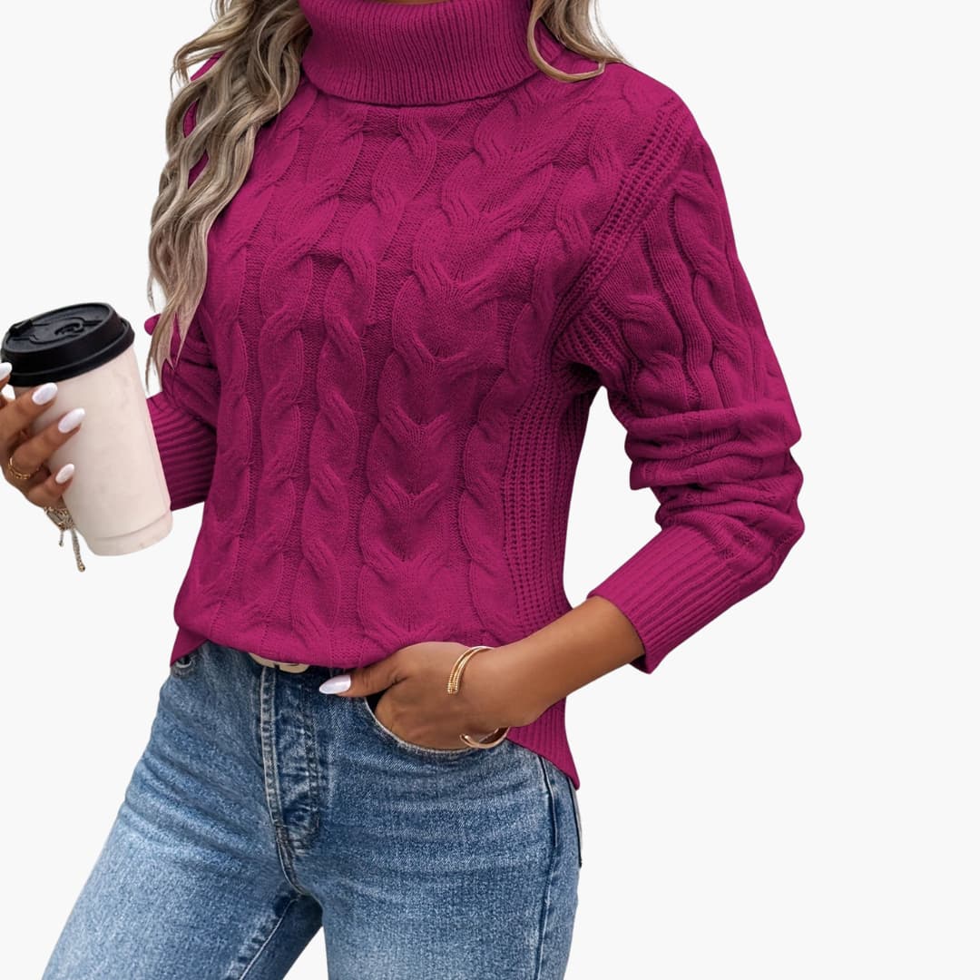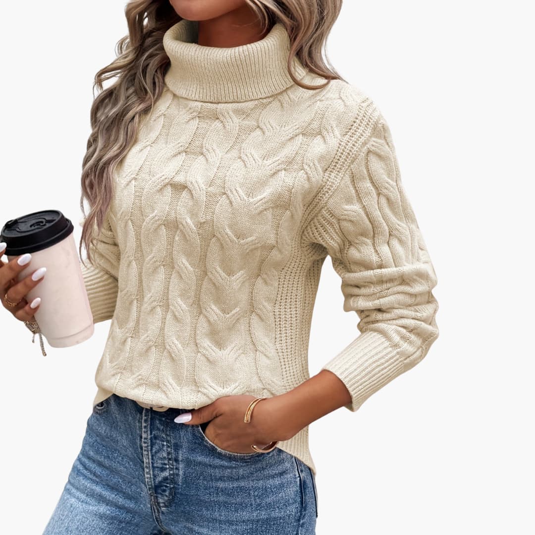 Cable Knit Turtleneck Sweater for Women with Ribbed Cuffs and Hem.
