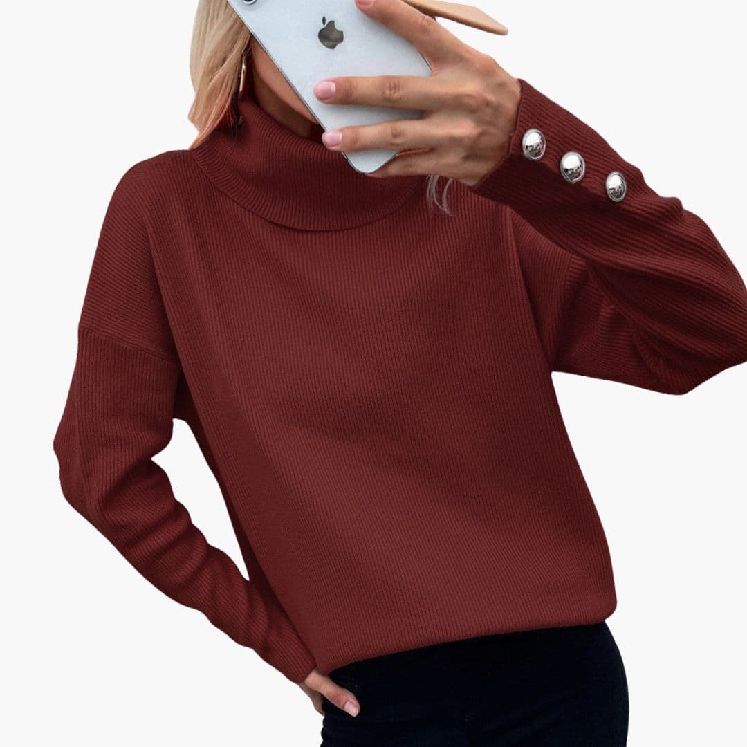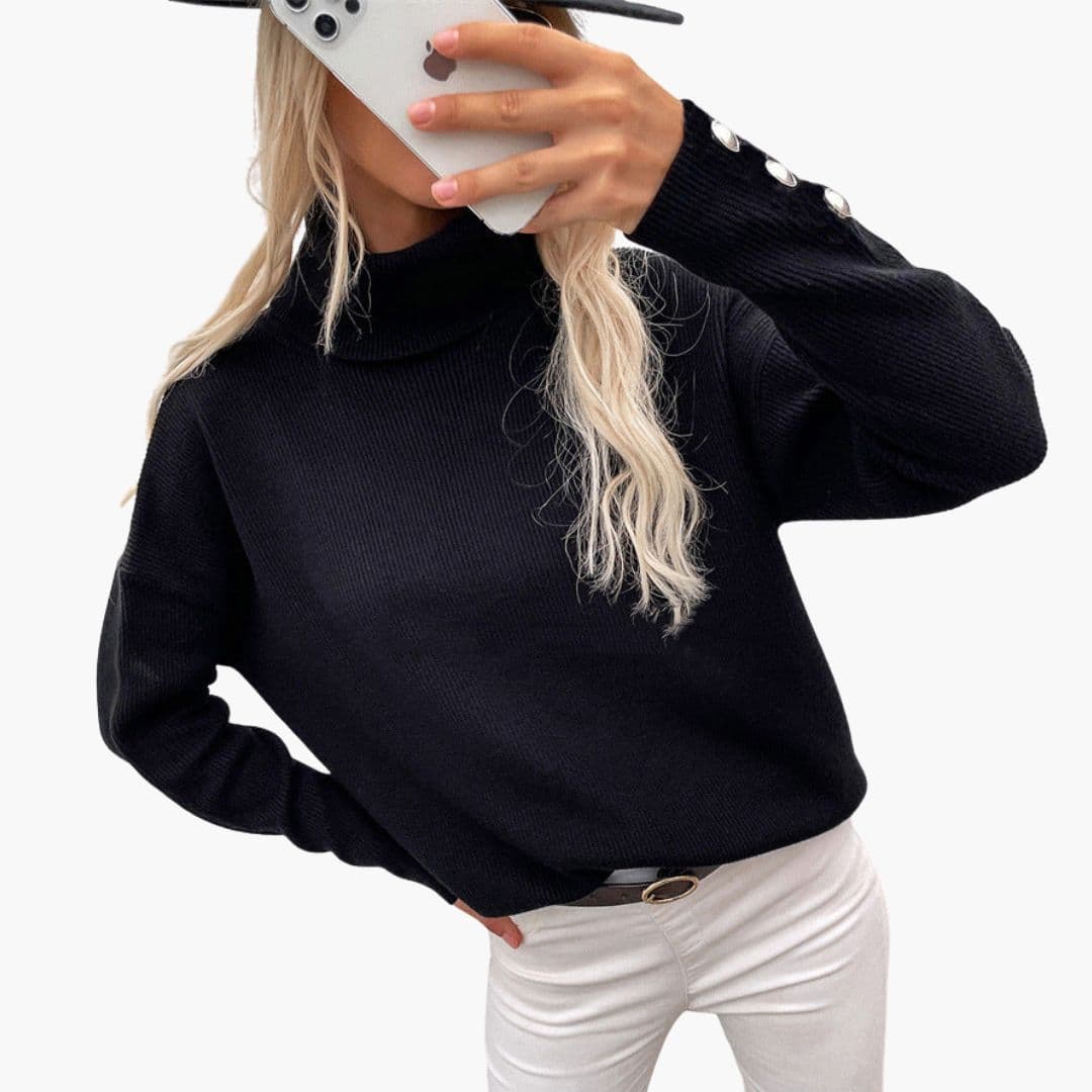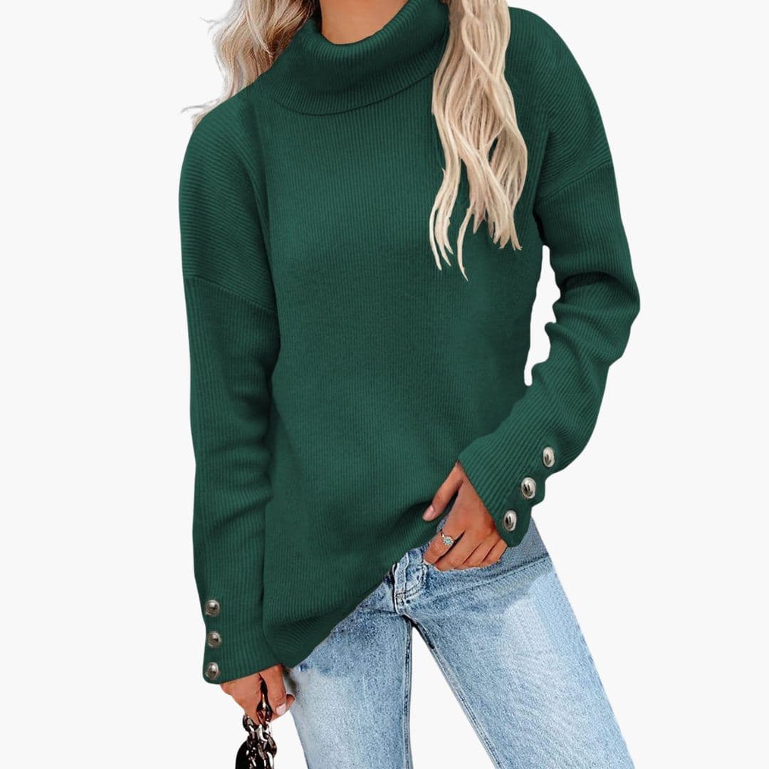 Women’s turtleneck sweater featuring ribbed knit design and decorative button cuffs.