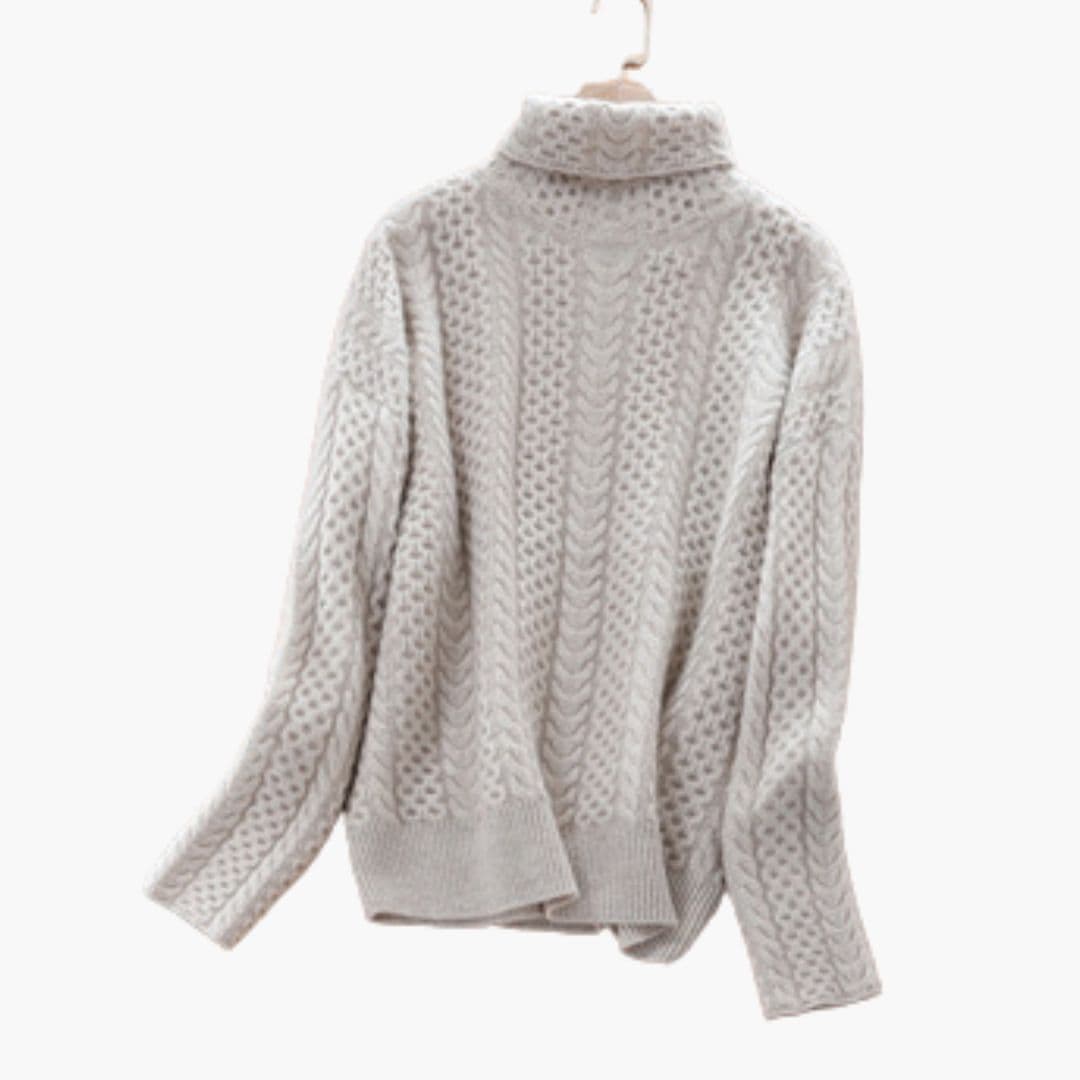 Women’s turtleneck sweater featuring cable knit pattern and ribbed trim.